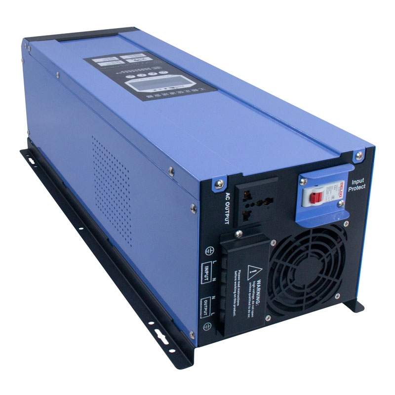 FSY-Smart50202 Inversor de onda senoidal 24V 5000W Múltiplas funções de proteção, como curto-circuito, sobrecarga, sobre/subtensão e superaquecimento. Carregamento de alta corrente com alimentação elétrica, exibição em tempo real da corrente de carregamento, velocidade de conversão em milissegundos, função UPS. Saída 210V-240V/105V-120V ajustável, tensão de saída estável. Pode ser usado para: máquina de corte, máquina de lavar, aquecedor de água, bomba de água, máquina de sorvete, carga resistiva de 5000W, motor de 2000W, etc.